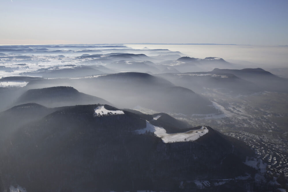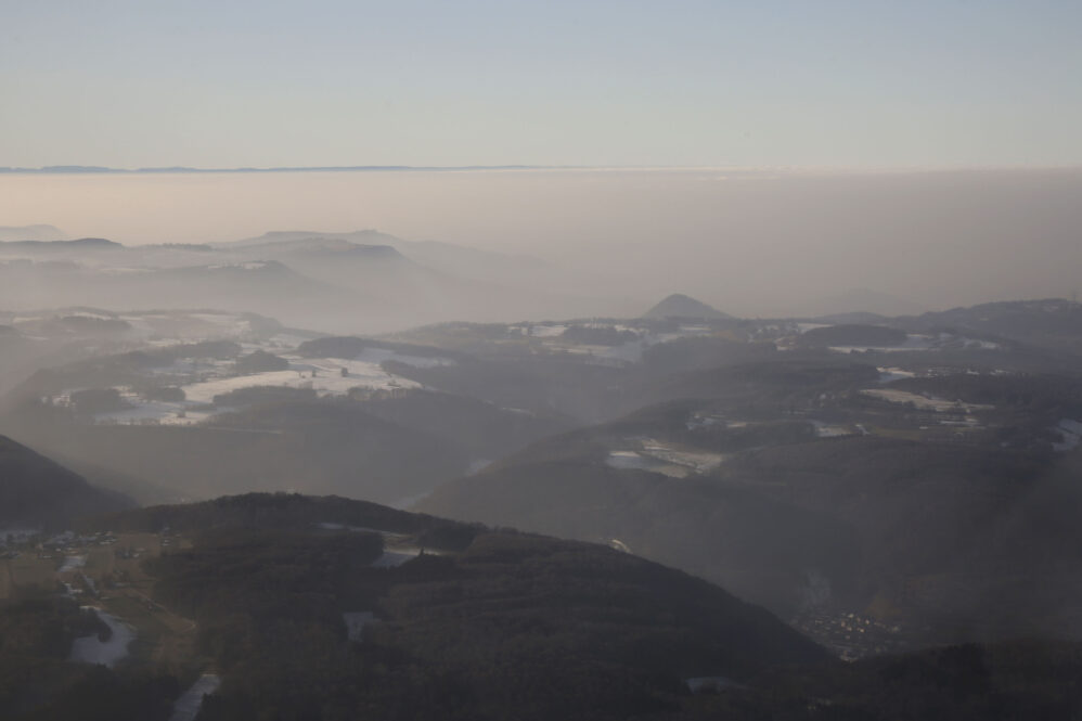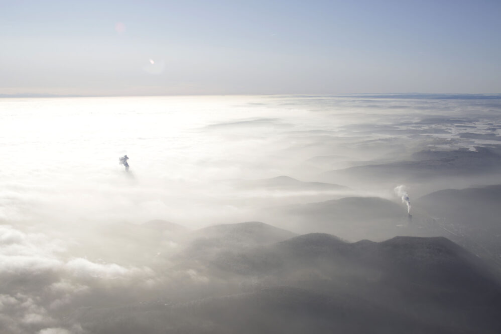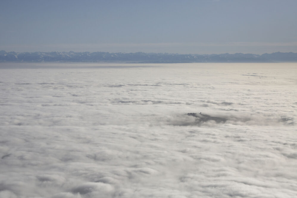 Entlang der Nebelgrenze ging unser Flug nach Osten bis Heidenheim. Auf dem West-Kurs zur Hahnweide ist dann frappierend, wie schlecht die Sicht unter der Inversion im Gegenlicht von der Ferne aussieht. Die Inversion ist mit dem Lineal gezogen und wir hatten 10°C Aussentemperatur.