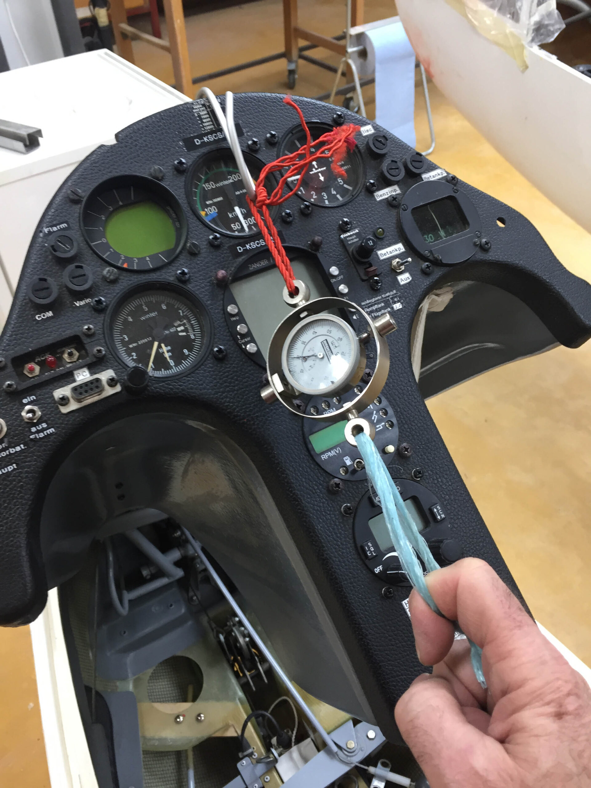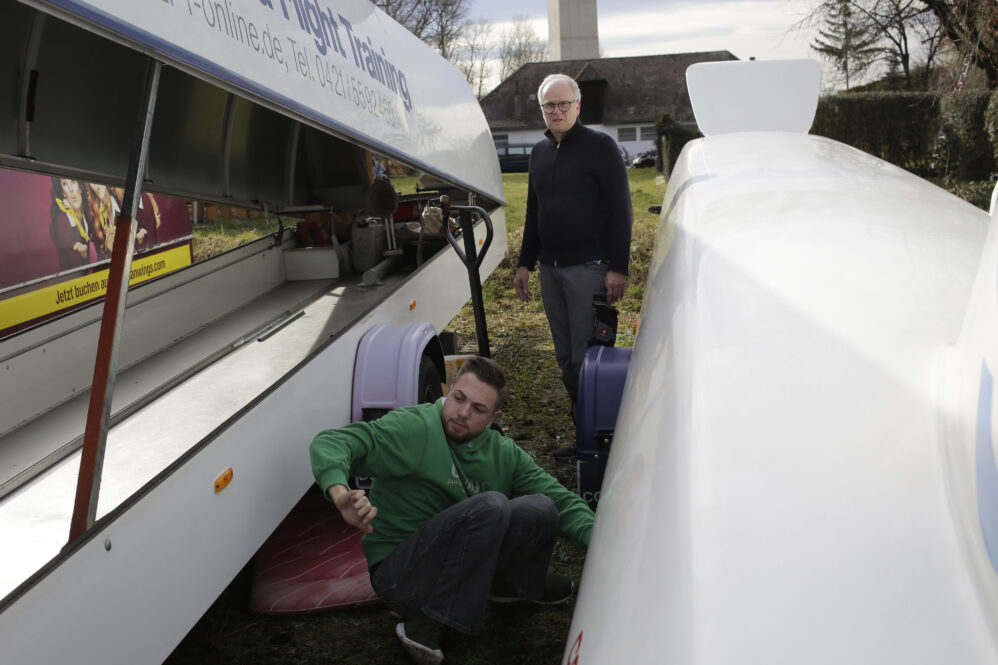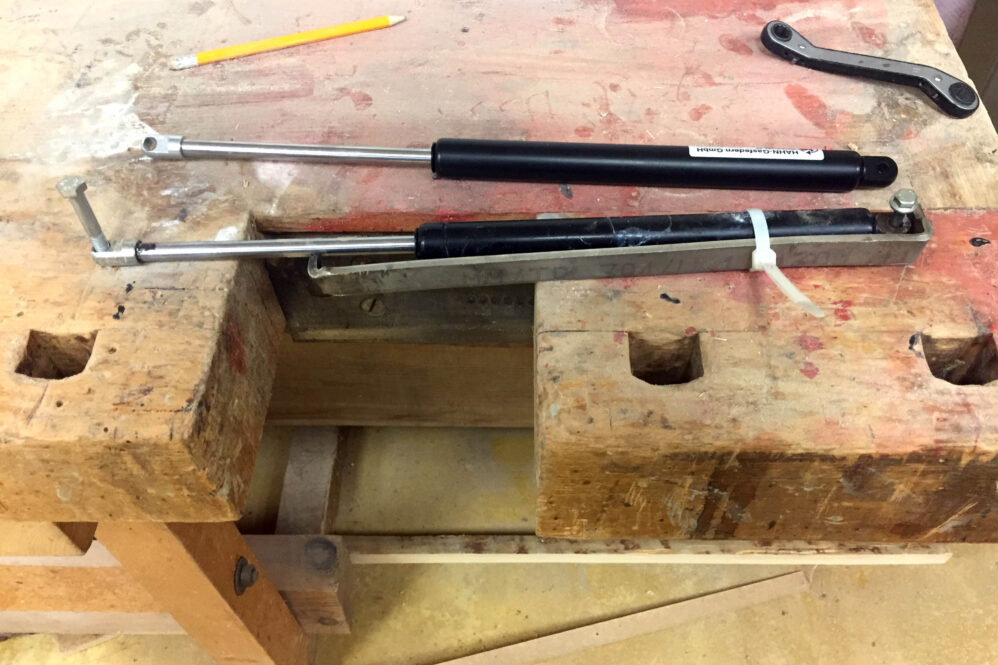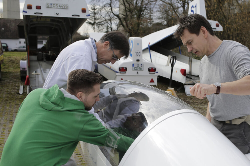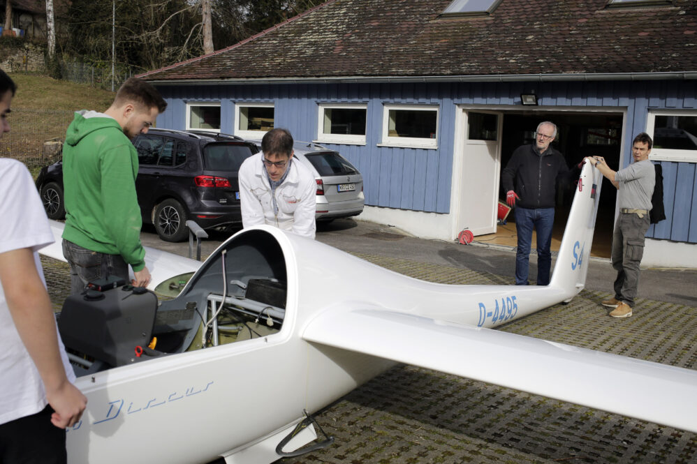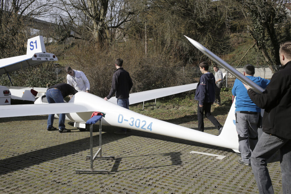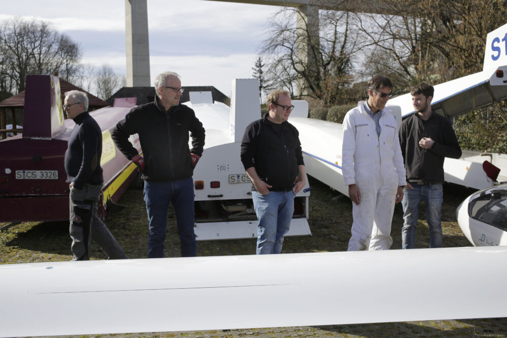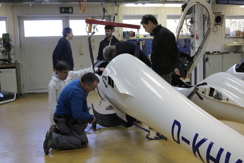 Wir hatten eine neue Feder bestellt und wollten sie tauschen. Ein Holländer hat uns auf der Hahnweide erklärt, dass es nicht die kleine Reparatur auf dem Flugplatz ist. Er hatte recht. Ich habe mich telefonisch bei Fa. Schleicher aufklären lassen – und wir sind’s dann in unserer Werkstatt angegangen. Es hat mehr als einen Werkstattabend gekostet. Zwischendrin dachte ich, wir müssen das Flugzeug in die Röhn fahren. Mit ein paar Hilfswerkzeugen und viel Schweiß geht’s – und so stolz waren wir auf uns, als das Ding endlich drin war!