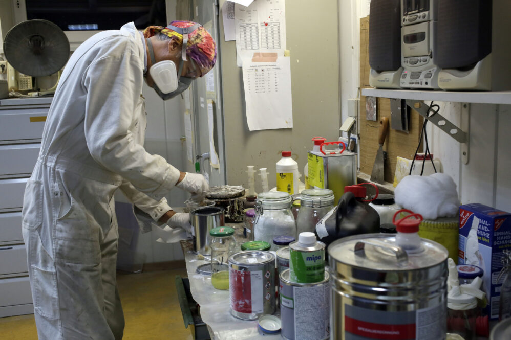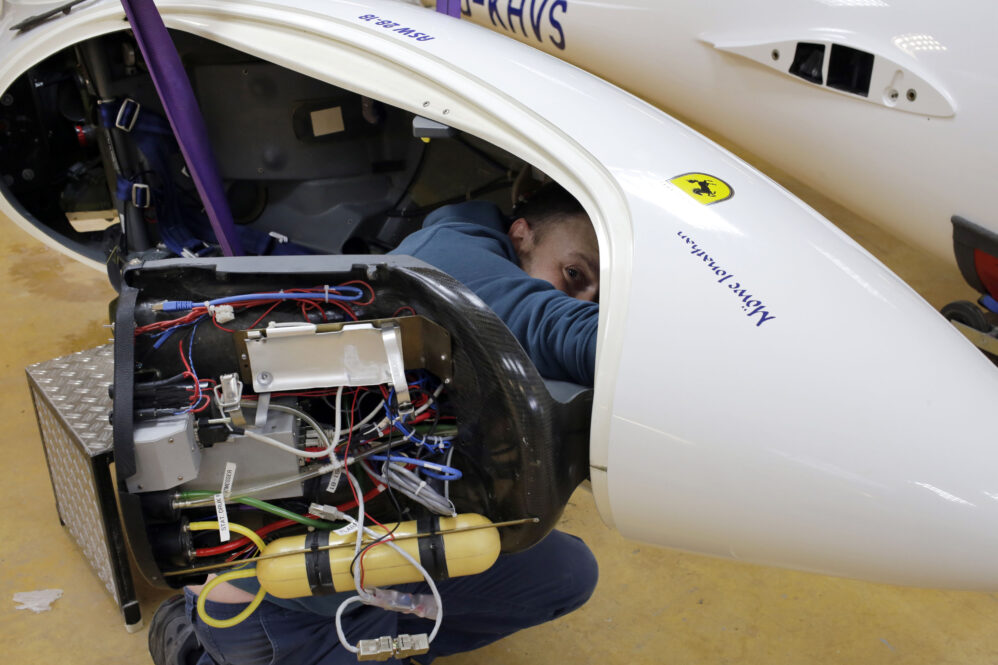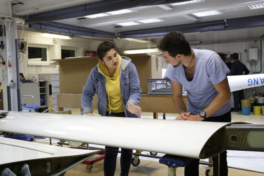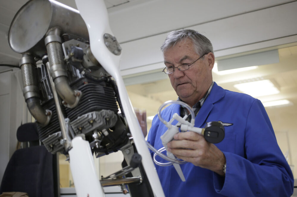 Andreas prüft den ersten Rumpf, gleichzeitig werden die zugehörigen Flügel und das Höhenruder aus dem Hänger raus auf Böcken für die Prüfung bereitgelegt. Wenn der erste Rumpf fertig geprüft ist, wird die Sitzschale wieder eingebaut – und Andreas prüft gleichtzeitig die Flügel. Dann wird das Flugzeug zusammengebaut und fertig geprüft.