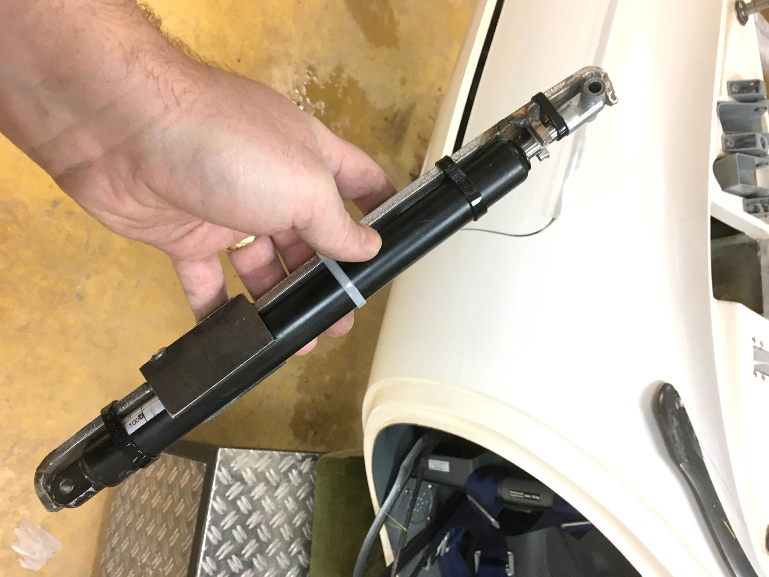 Wir hatten eine neue Feder bestellt und wollten sie tauschen. Ein Holländer hat uns auf der Hahnweide erklärt, dass es nicht die kleine Reparatur auf dem Flugplatz ist. Er hatte recht. Ich habe mich telefonisch bei Fa. Schleicher aufklären lassen – und wir sind’s dann in unserer Werkstatt angegangen. Es hat mehr als einen Werkstattabend gekostet. Zwischendrin dachte ich, wir müssen das Flugzeug in die Röhn fahren. Mit ein paar Hilfswerkzeugen und viel Schweiß geht’s – und so stolz waren wir auf uns, als das Ding endlich drin war!