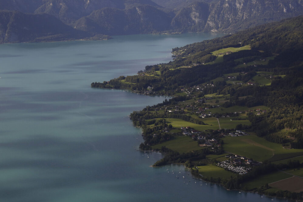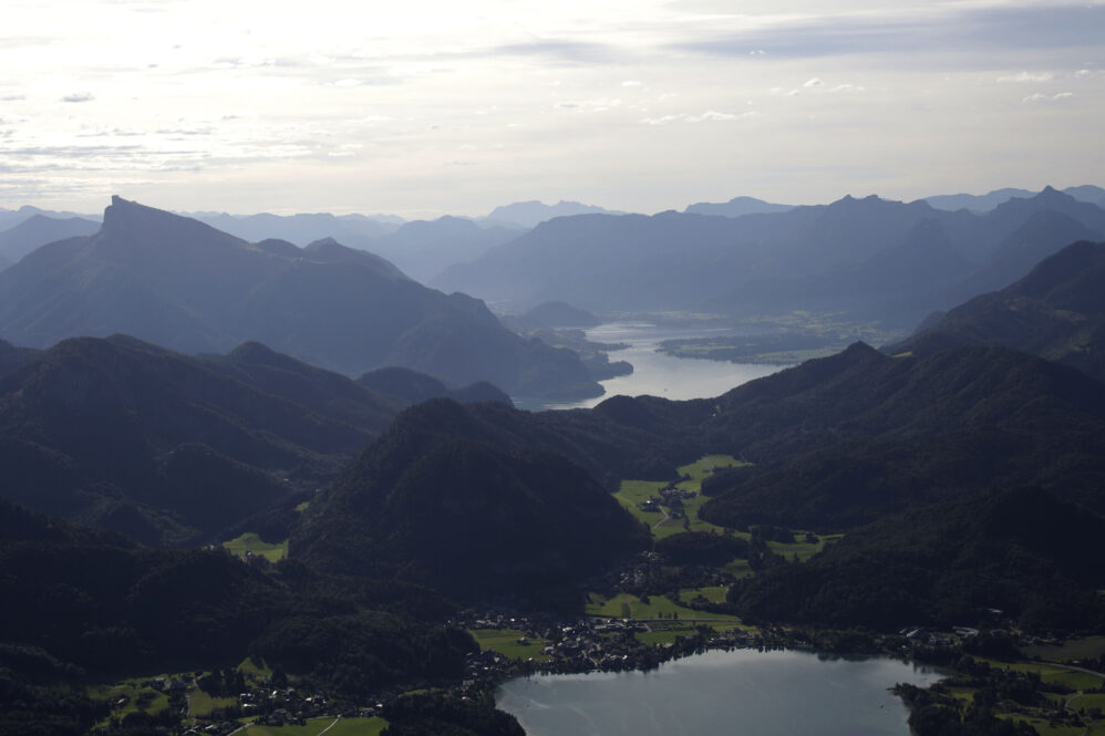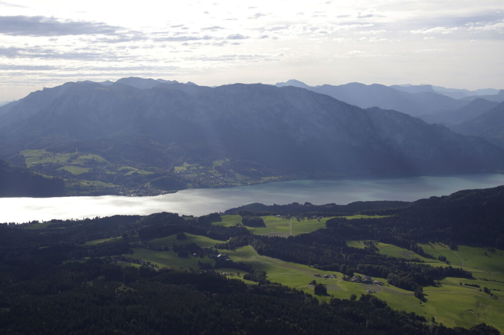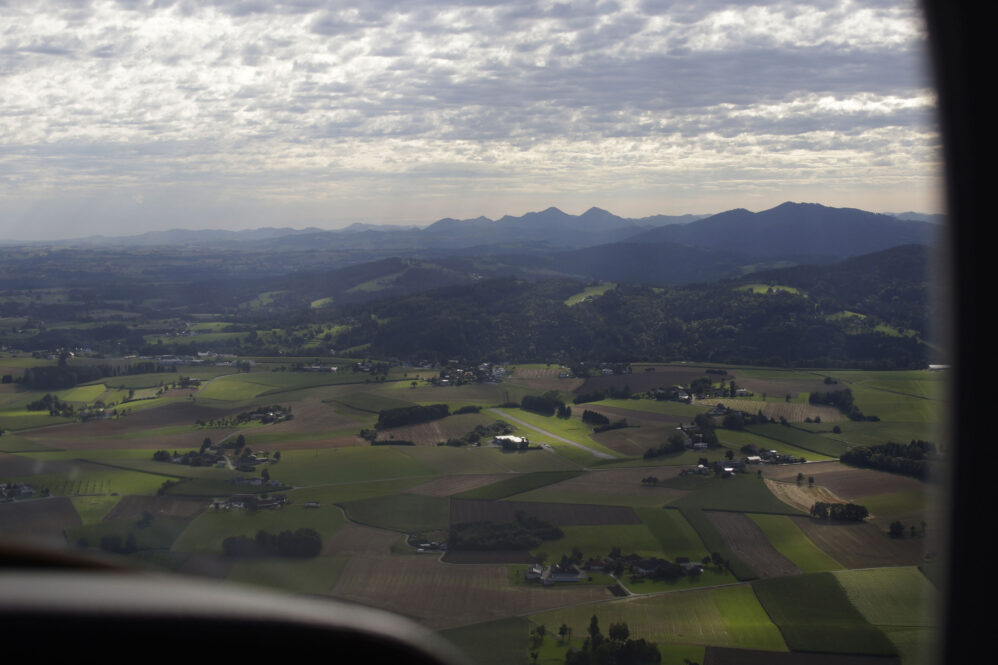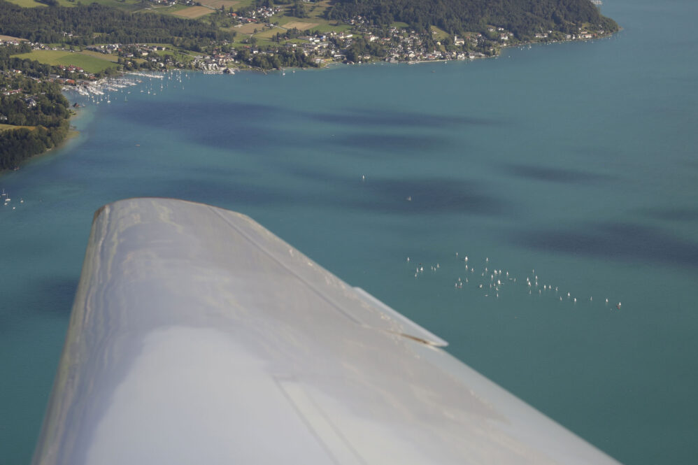 Der Flug am frühen Morgen war wunderschön und die Sicht großartig. Das Licht zeichnete malerisch lange Schatten, beim Rückflug wird es wieder so sein. Vorbei an Ammersee, Starnberger See und Chiemsee näherten wir uns Salzburg für ein midfieldcrossing in 3000ft. Kein Problem, der freundliche Fluglotse hat unsere Wünsche erfüllt und wir haben Dank unserem Navi seine Pflichtmeldepunkte ganz leicht gefunden. Östlich Salzburg wird die Szenerie noch traumhafter. Die Seen des Salzkammerguts begrüßen uns wie glitzernde Edelsteine, sie fließen förmlich aus dem Gebirgsstock des Karwendel heraus. Fuschlsee, Mondsee, weiter entfernt rechter Hand der Wolfgangsee, dann Attersee und Traunsee. Teilweise liegen sie mit ihrer südlichen Hälfte zwischen steilen Felswänden, manche kleinere Seen sind auch komplett umarmt vom Fels. Die Berge wachsen ohne Vorgeplänkel aus der Ebene heraus und stehen ganz mächtig da!