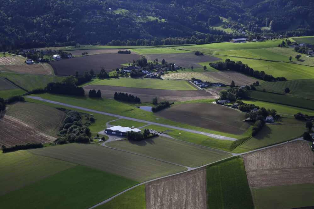 Bei der Landung auf dem gepflegten Verkehrslandeplatz Gmunden war der Wind direkt auf unserer Nase, passte also gut. Den ersten Parkplatz haben wir wieder verlassen – der Boden war zu steinig für unsere Erdanker. Aber Franz hat eine schöne Alternative hinter den Hallen gefunden und der Flugleiter war einverstanden.
