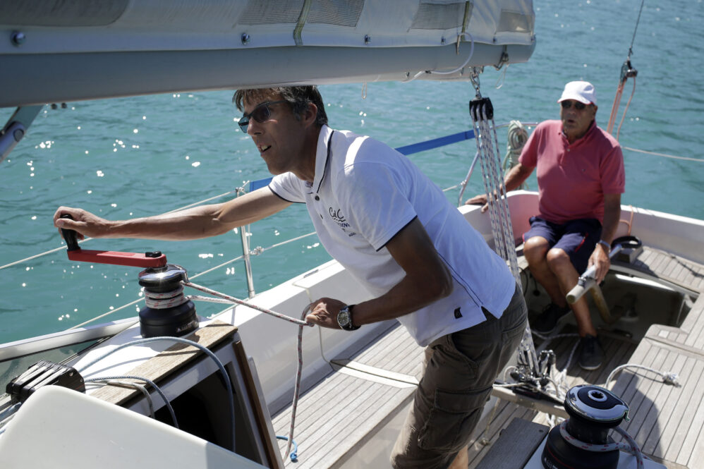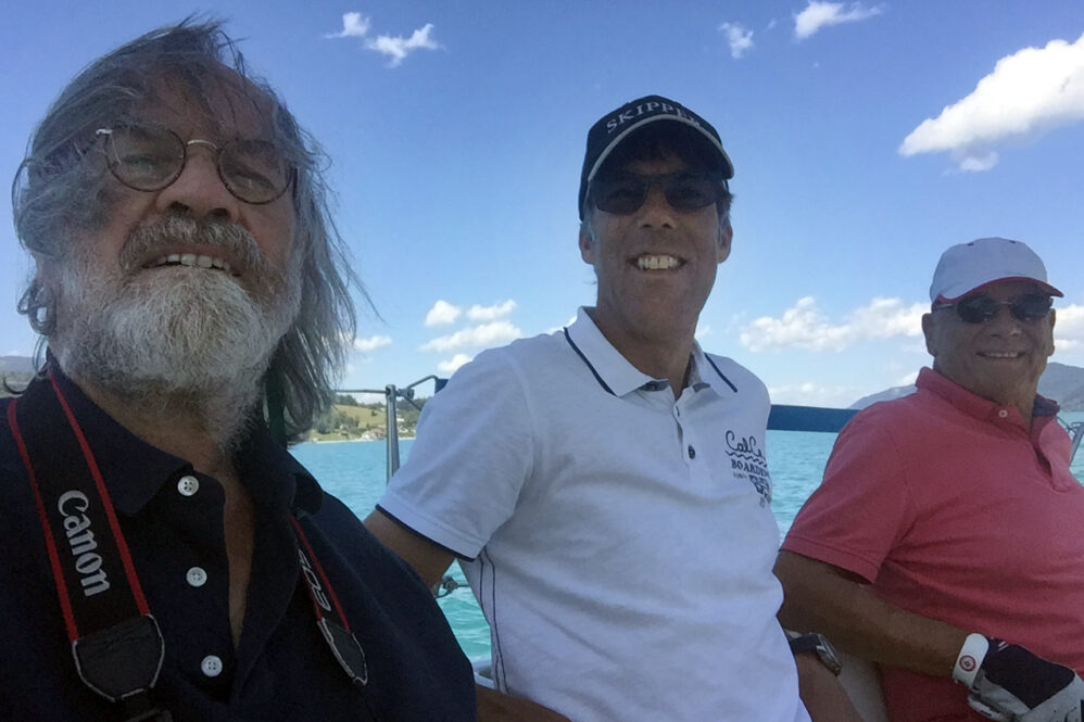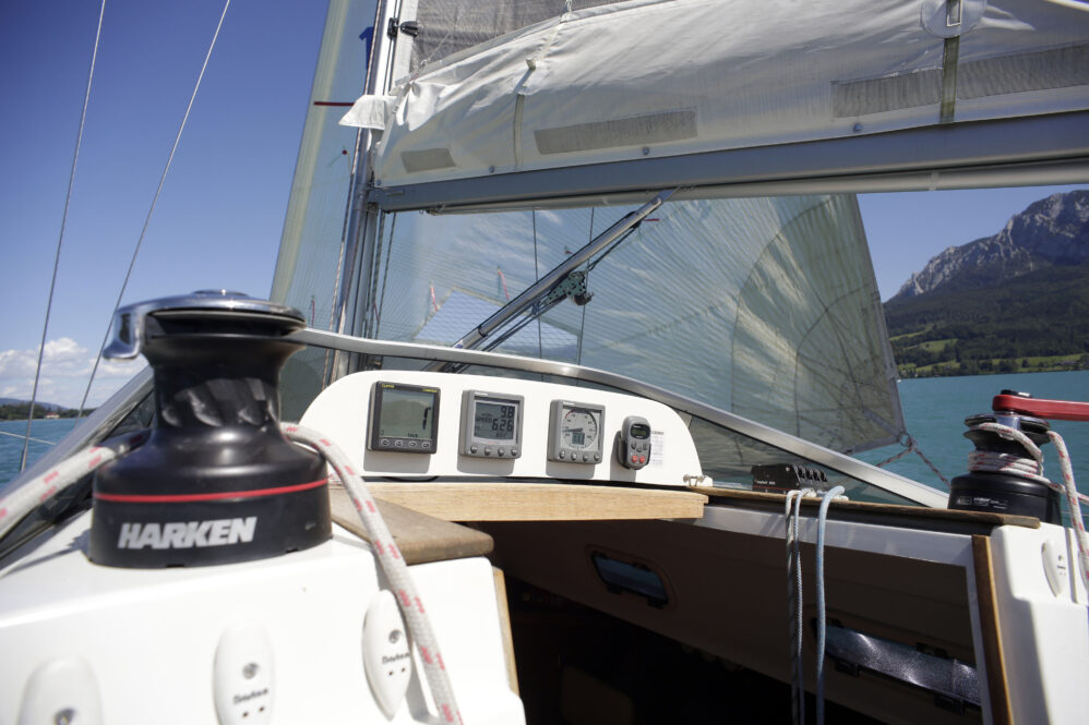 Wir legen mit elektrischem Innenborder ab und setzen Segel – dem Wetterbericht geschuldet lässt Hilmar das erste Reff drin. Es ist eine Kajütyacht mit Rennbesegelung – hat also alle Trimmmöglichkeiten für die Segel. Das Einlernen eines erfahrenen Windsurfers (Franz) auf das Boot dauert ja seine Zeit. So war’s gut, dass uns nicht gleich die harten Böen erwischt hatten. In welcher Drehrichtung legt man die Schot um die Winsch? Aha – die Winsch hat zwei Gänge – links rum kurbeln langsam – rechts rum schnell – ein geniales Teil. Dann muß der Vorschoter noch die Holepunkte für die Genuaschoten bedienen – Hilmar hat Franz ganz schön auf Trab gehalten.