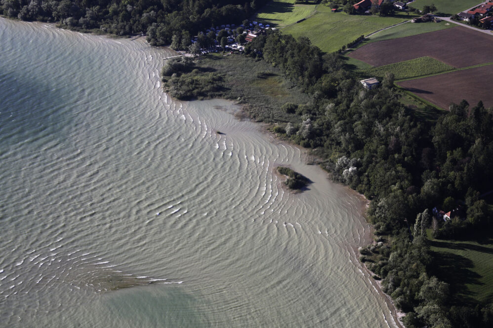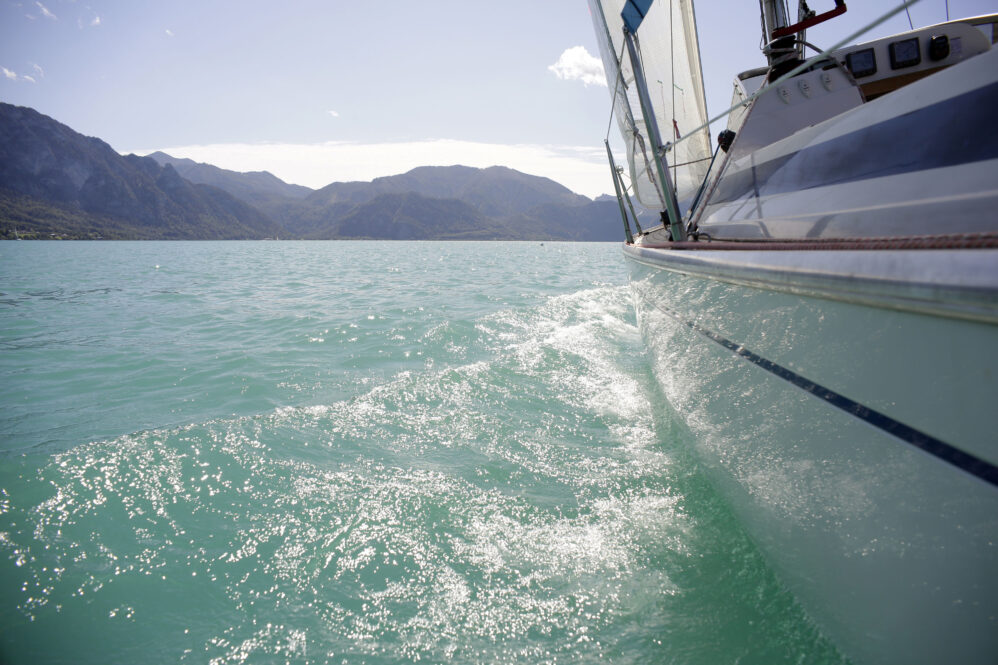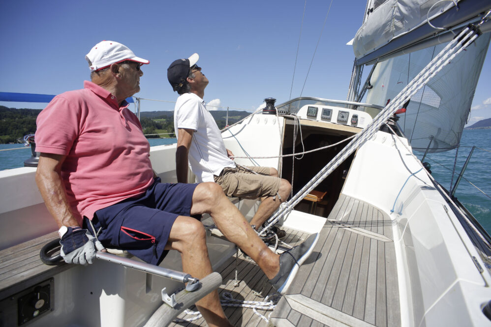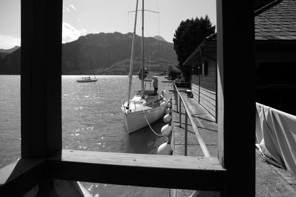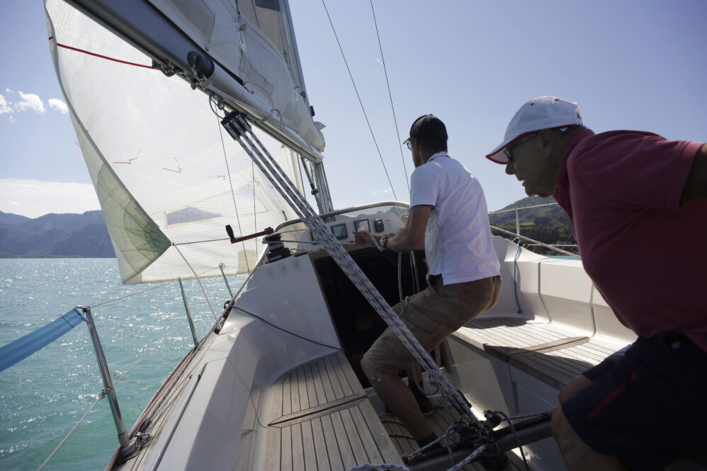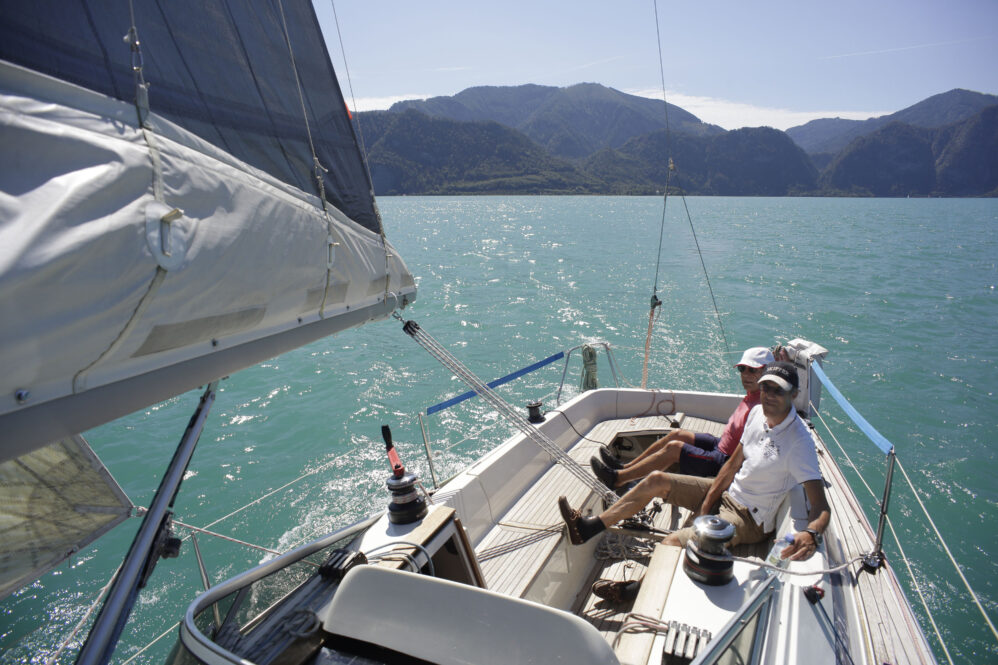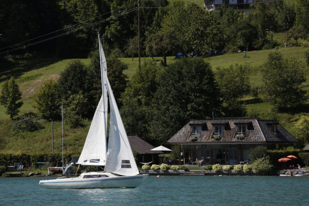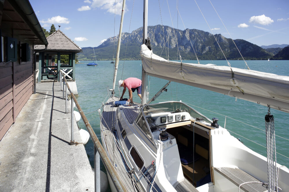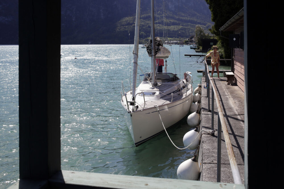 Sollen wir Segeln? Aaah – es sind starke Böen vorhergesagt. Der Wind steht quer zum See und wird durch das im Weg liegende Gebirge turbulent sein. Bei dieser Windrichtung ist Respekt geboten. Es hat noch andere Boote auf dem See – viele allerdings nicht. Aber gehen wir zum Boot und wollen es wagen. Hilmar hat das Boot vorsorglich schon von der Boje an den Steg gelegt – damit wir bequem einsteigen können – ein Superservice.