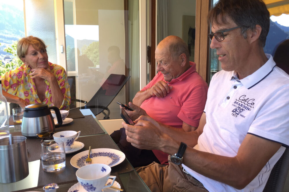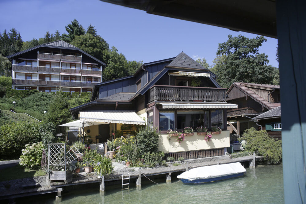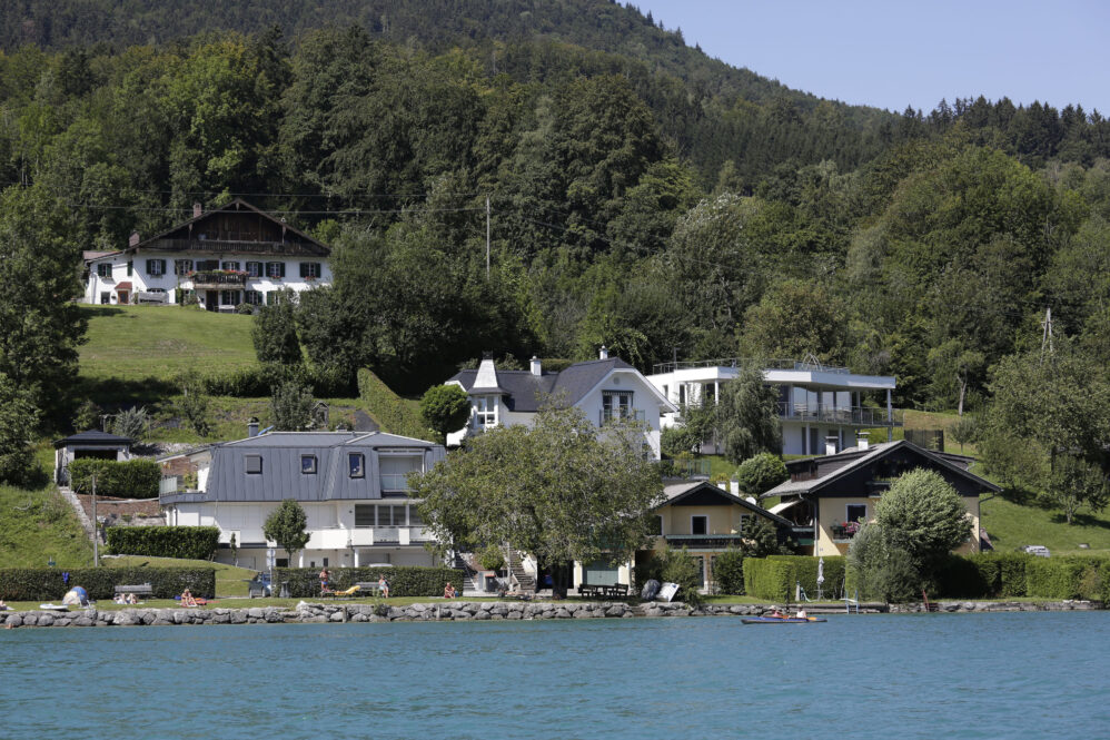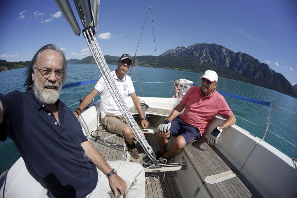 Es folgt die Sightseeingtour im Tesla über den Höhenrücken vom Traunsee zum Attersee. Das Ufer des Sees ist schmal und begehrt – wie alle Ufer – und deshalb kreativ bebaut. Ältere Villen haben links und rechts vom Haus noch Platz, die neuen Häuser rücken so dicht zusammen wie die Vorschriften erlauben. Da das Ufer steil ist, haben die Menschen in den weiter hinten liegenden Hausreihen auch einen freien Blick zum See – es ist wie im Amphitheater! Wir rollen elektrisch vorbei an Hilmar’s Jugenderinnerungen und wir stoppen beim Fischer. Ulla hat eine Lachsforelle bestellt, die war noch warm vom räuchern. Der Attersee ist das 2. zuhause von Hilmar und Ulla, es war eine große Freude des Wiedersehens bei uns allen. Den vorzüglichen Fisch gab’s mit Kren auf dem Balkon – dazu Sicht auf See, Schiffe und den Brennerin. Das ist der nächste Berg. Was will man mehr?