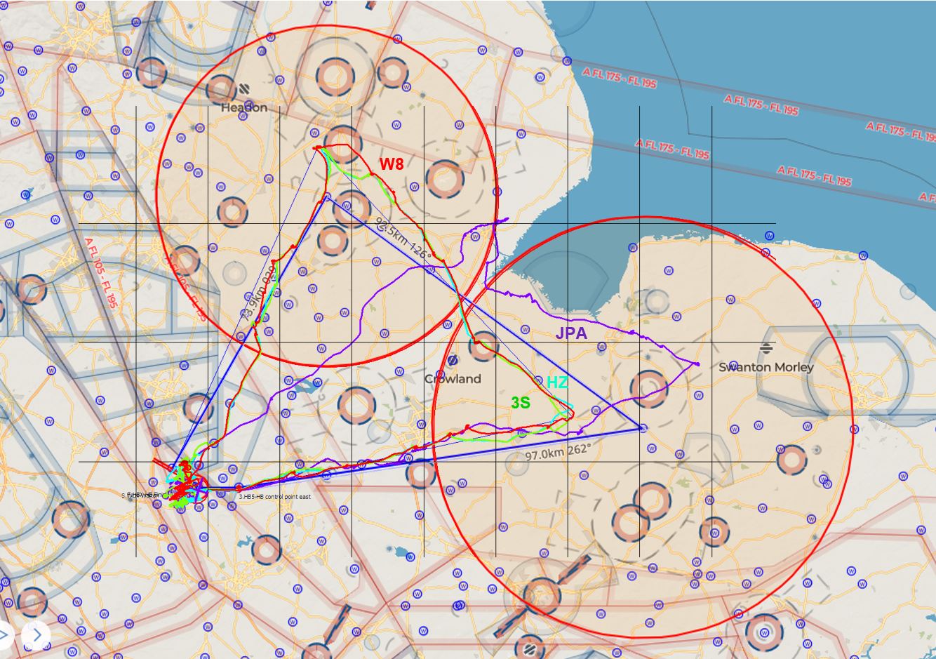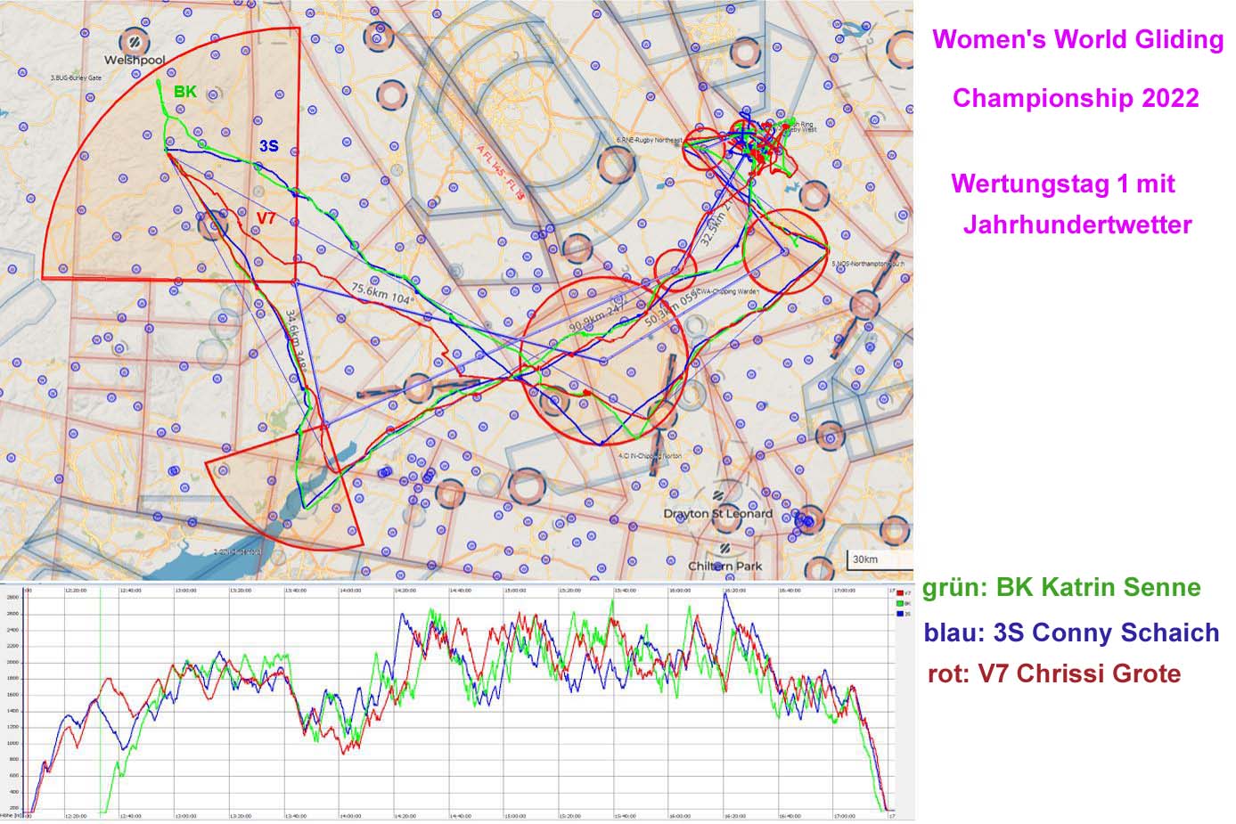 Der erste Wettbewerbstag brachte uns dann ein absolutes Rekordwetter, das Beste, was die Engländer seit 1976 erlebt haben. Die Task Setter dachten sich ein 3,5h AAT für die 18m- und die Standardklasse aus. Der nordwestliche AAT-Sektor lag in Wales, wo man nur sehr selten hinfliegen kann, toll! Alle waren in der Luft, die Startlinien offen, als Katrin funkte, die 18m-Klasse geht jetzt los. Das war für uns Standard-Mädels die perfekte Gelegenheit, mitzugehen. Ich konnte einige Bärte lang mit den schnelleren 18ern mithalten und sie kurz vor der ersten Wende aufgrund eines überdurchschnittlichen Bartes nochmal fast einholen.