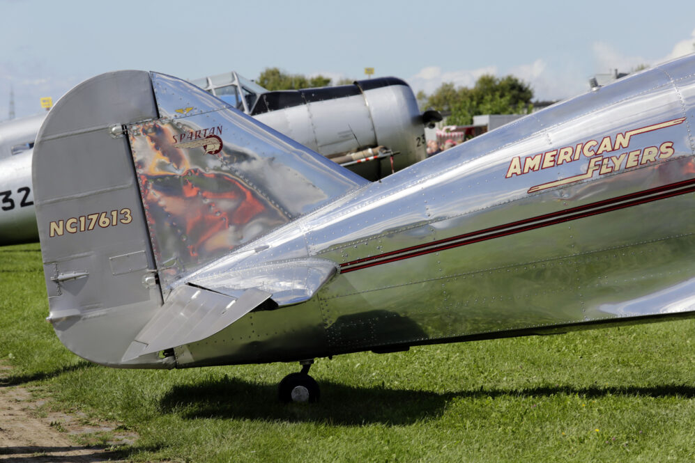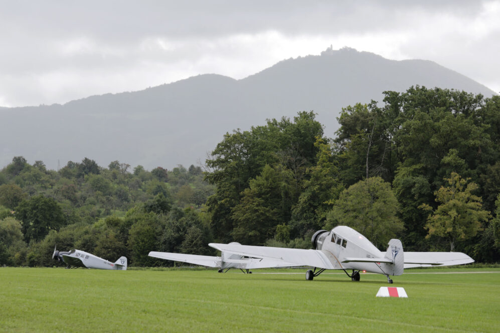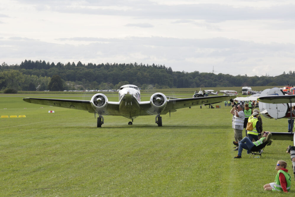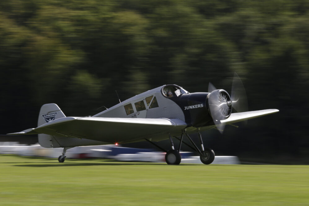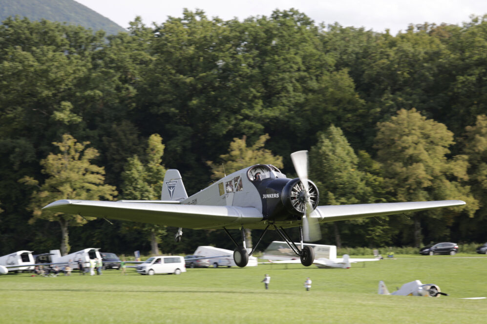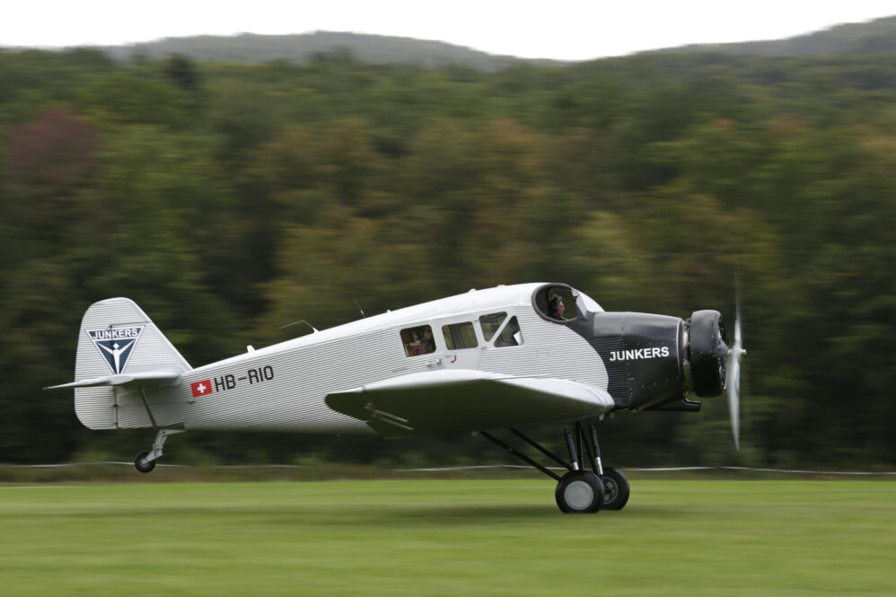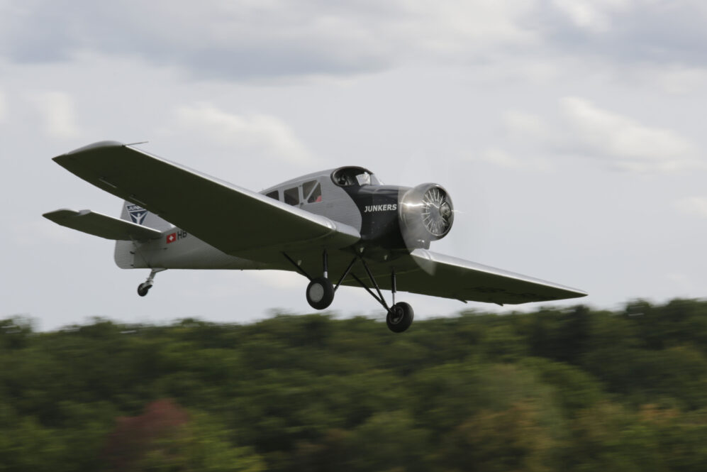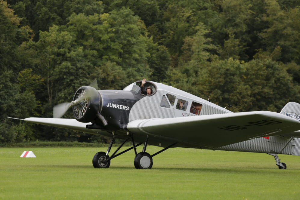 Jetzt kommt das erste Verkehrsflugzeug. Es ist ein Nachbau der Junkers F13 von Dieter Morszeck, entstanden 2016 mit Pratt & Whitney R-985, 450 PS. Die erste F13 flog 1919 – und hatte einen BMW IIIa mit 185 PS. Die Piloten brauchen noch den Kontakt zum Element Luft, die 4 Passagiere sitzen trocken und nicht so kalt wie die Piloten.