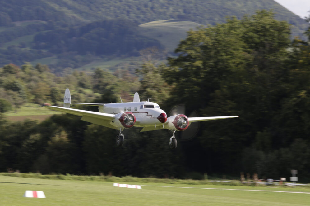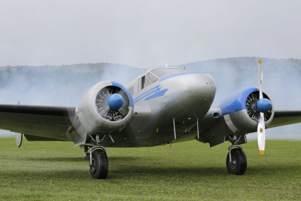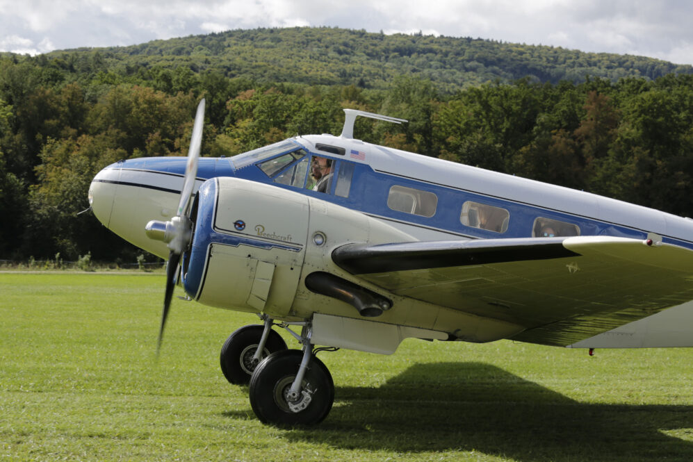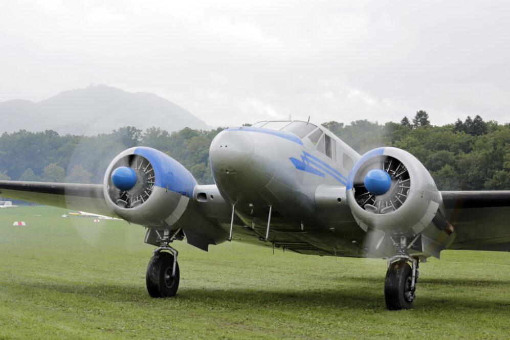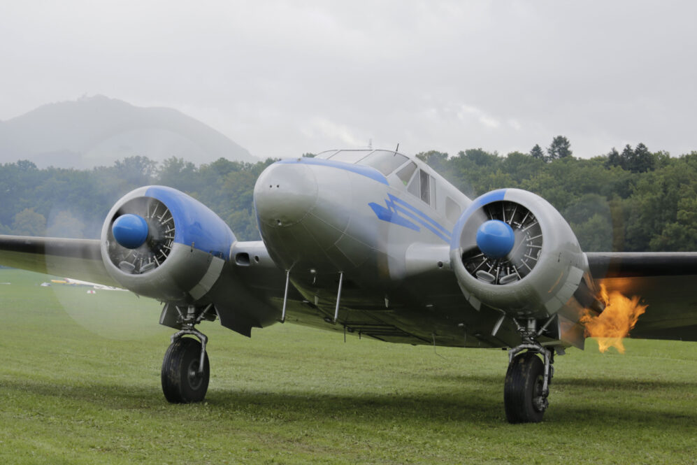 Ganz ähnlich gestaltet ist die Beech 18, mit 2 x Pratt & Whitney R-985. Sie ist auch für 6 Passagiere und 2 Piloten. Erstflug 1937. Bilderfolge: rechter Motor läuft schon, der linke speit Feuer – um dann zu laufen.