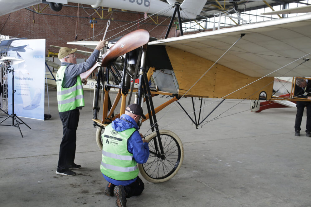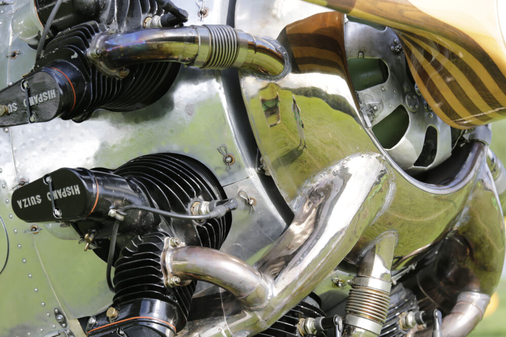 Jetzt kommen wir zu älteren Modellen. Zuerst die berühmte Bleriot XI von Michael Carlson mit einem Umlaufmotor Gnome Omega mit 50 PS, Baujahr 1918. Umlaufmotor heißt: Die Kurbelwelle ist am Brandspant festgeschraubt, der Motor dreht sich mit dem am Motorgehäuse festgeschraubten Propeller. Damit wird die Kühlung der Zylinder besser. Nachteile gibt’s aber auch: Das Trägheitsmoment des drehenden Motors ist mächtig.