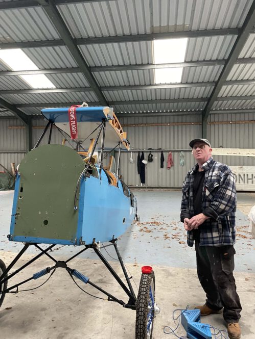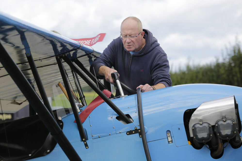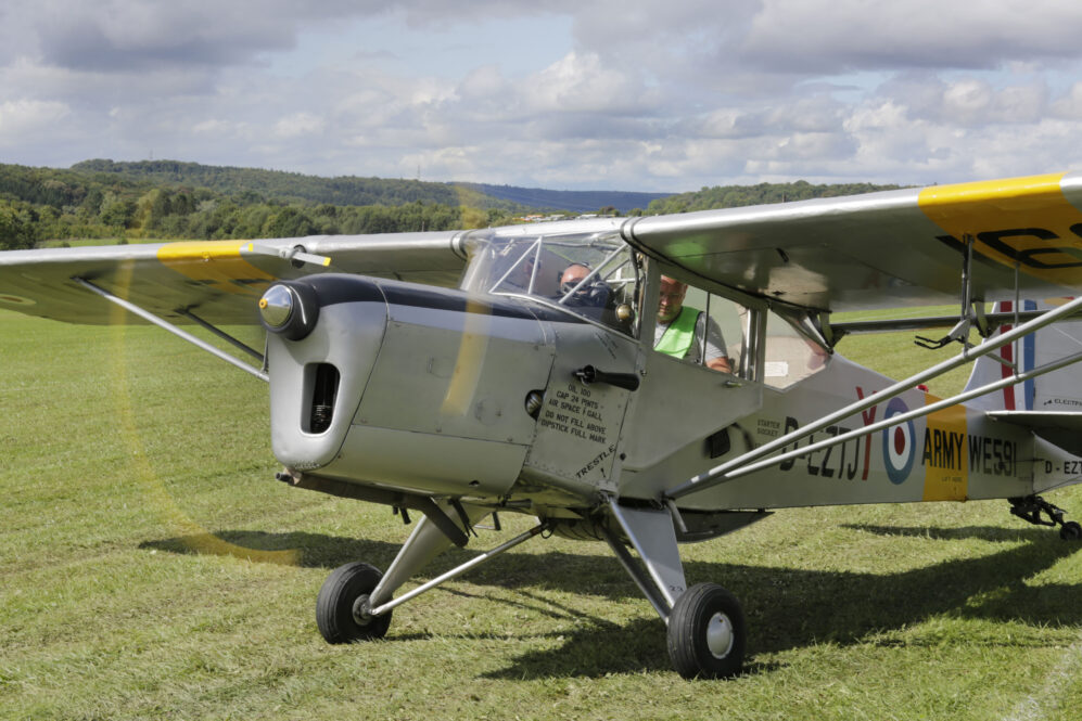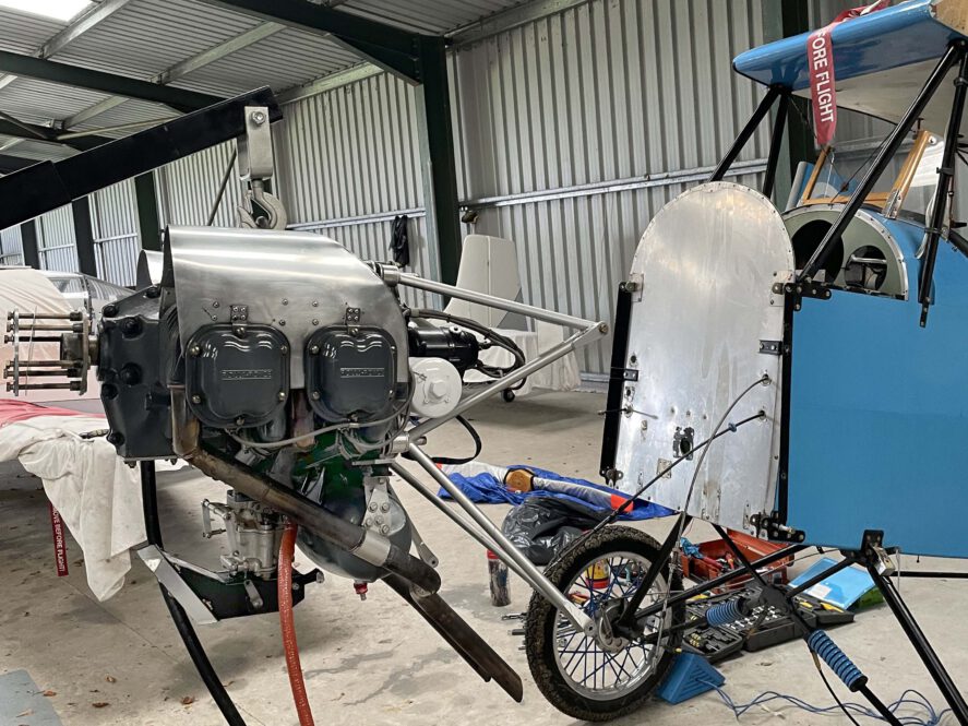 Wie schon 2019 war Tony Ryan mit der Pietenpol Aircamper auf der Hahnweide. Tony hatte Pech beim Rückflug am Montag – mitten über Frankreich ist ihm der Motor stehen geblieben. Er konnte aber auf einem schönen Stoppelfeld landen und war guten Mutes: Er will wieder kommen! Inzwischen hat er das Problem auch gefunden: Am Kraftstoffhahn hatte sich eine Verschraubung gelöst. In der Position „Ein“ musste man ihn nur leicht bewegen, und schon wurde der Kraftstoff abgestellt. Der Motor ist ein Continental, obwohl Rolls Royce auf den Zylinderkopfdeckeln steht: Continental 0-200 built under licence by Rolls Royce in Derby