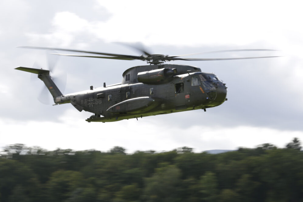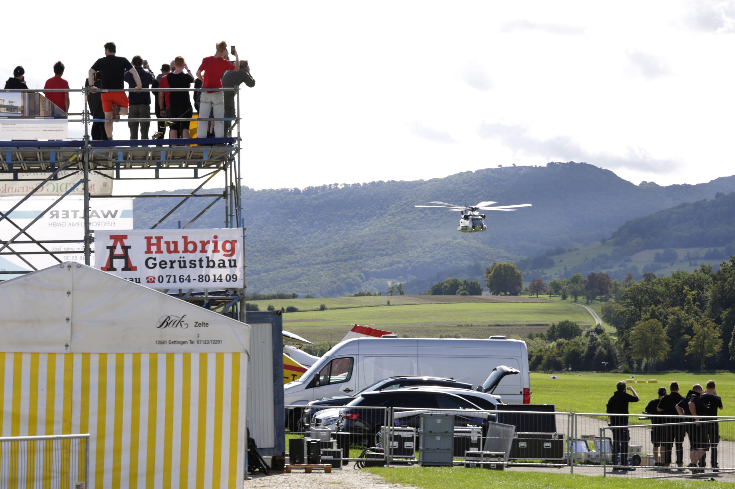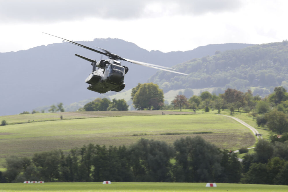 Es geht los mit dem Hubschrauber CH53 – er ist schon am Donnerstag angeflogen gekommen, gelandet und dann an seinen Präsentationsplatz geschleppt worden.