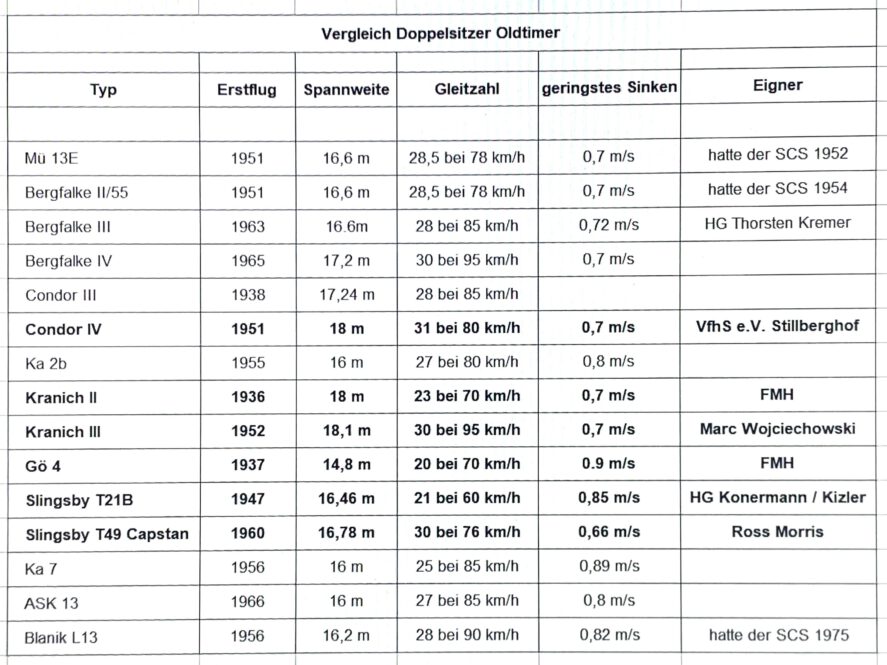 Die Gleitzahl der besten Doppelsitzer aus Holz oder Stahlrohr liegt zwischen 31 bis 29 – also so wie eine Ka 6. Die Tabelle lässt einen direkten Vergleich zu. Mit eingefügt sind ältere Modelle: Kranich II, Gö4 etc. Die beim OTT 2025 teilnehmenden Segler sind markiert.