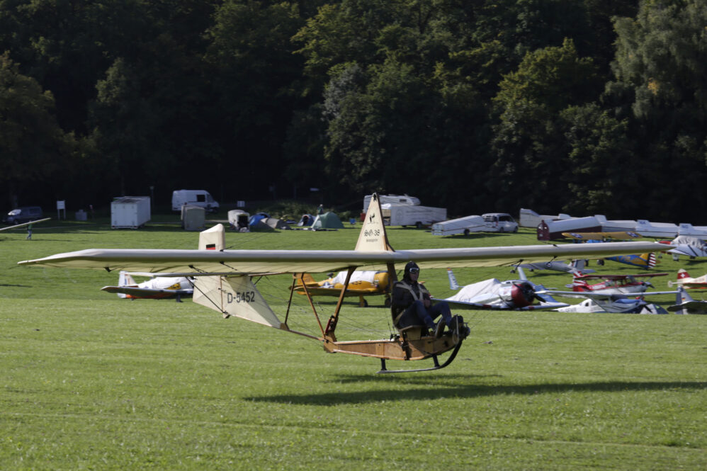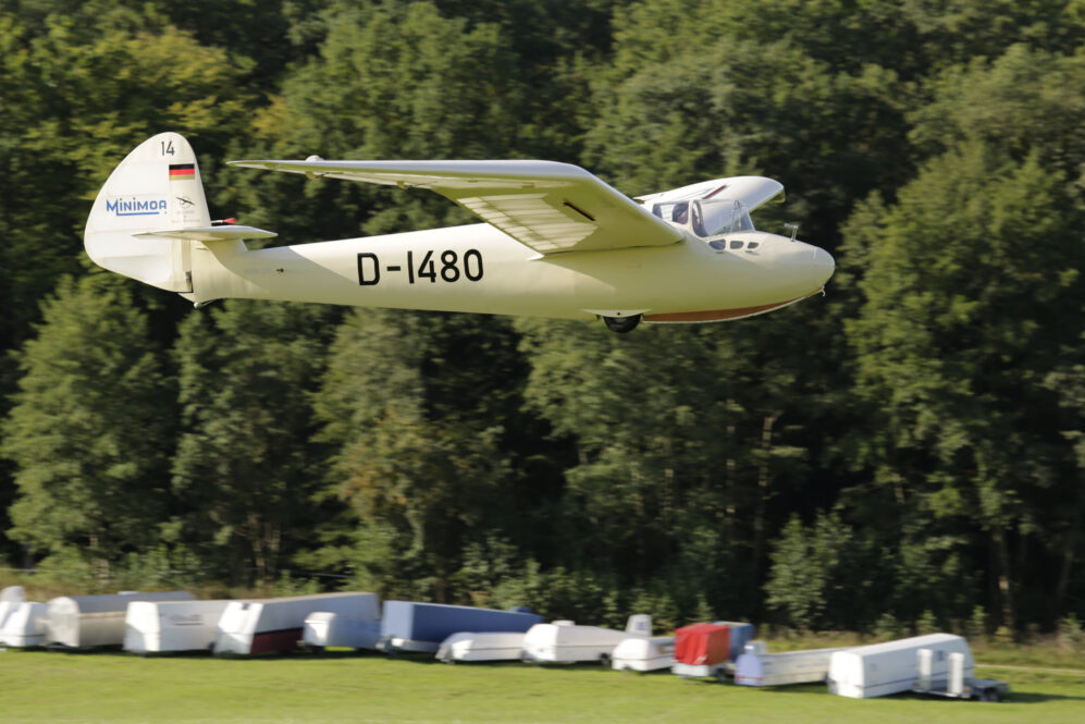 Minimoa mit Ralf Riethmüller. Das Flugzeug hatten Otto Bacher und Christian Mathieu restaurieren lassen. Jetzt gehört es dem Fliegenden Museum Hahnweide e.V.