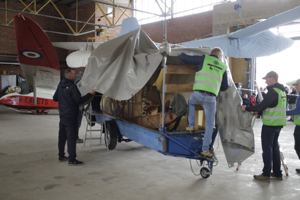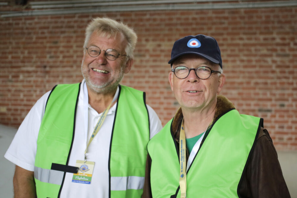 Max (hinter der Verglasung) wird den Kranich II fliegen, Ali trägt die Hälfte des schweren Hecks.
